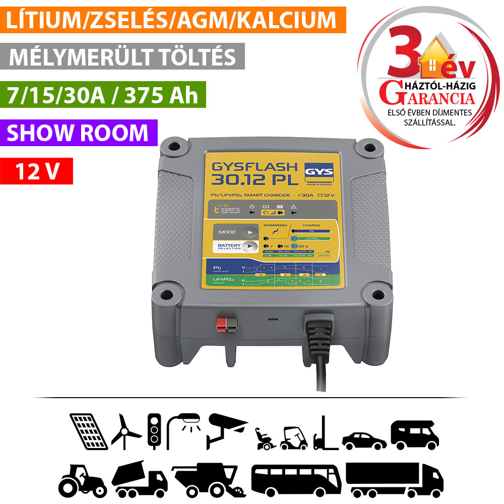 A 30 A teljesítményű GYSFLASH 30.12 PL egy többfunkciós töltő, amelyet 12 V-os ólom-savas és lítium-vas-foszfát akkumulátorok (LiFePO4) töltésére terveztek. 2 különálló intelligens töltési programmal rendelkezik, amelyek garantálják az egyes akkumulátortechnológiák teljesítményét. Akkumulátortámogató egységként is használható, és a «Showroom/Diag» üzemmód lehetővé teszi a bemutatótermi járművek akkumulátorainak biztonságos támogatását és karbantartását.